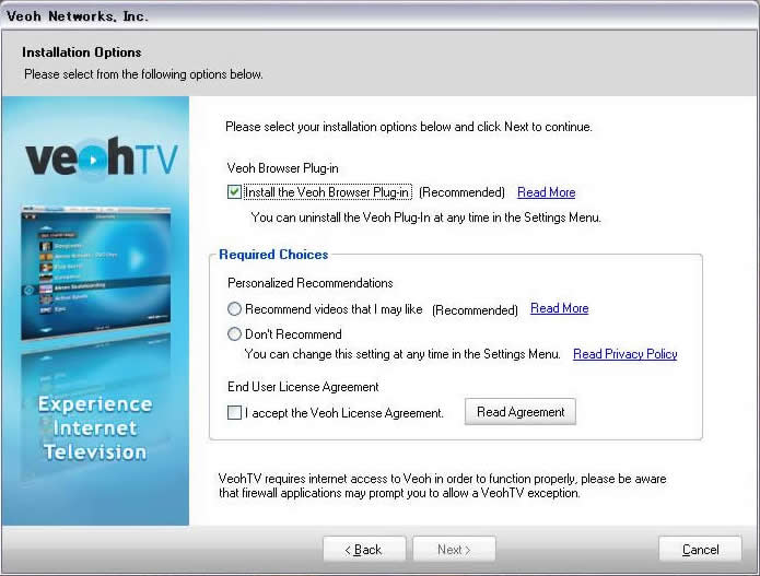 インストールが終わったら、「VeohTV」を起動するか聞いてきます。